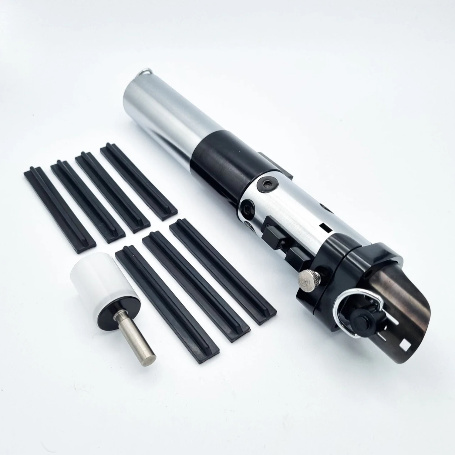 A Darth Vader saber inspired by Return of the Jedi, this hilt has been installed by Jimmy from Jimmy’s Saber Junk himself using his crystal reveal chassis, the crystal is wired to mimic blade colour and uses a recharge port and kill key, this saber comes with all the parts to set up in either New Hope or Empire Strikes Back configuration.