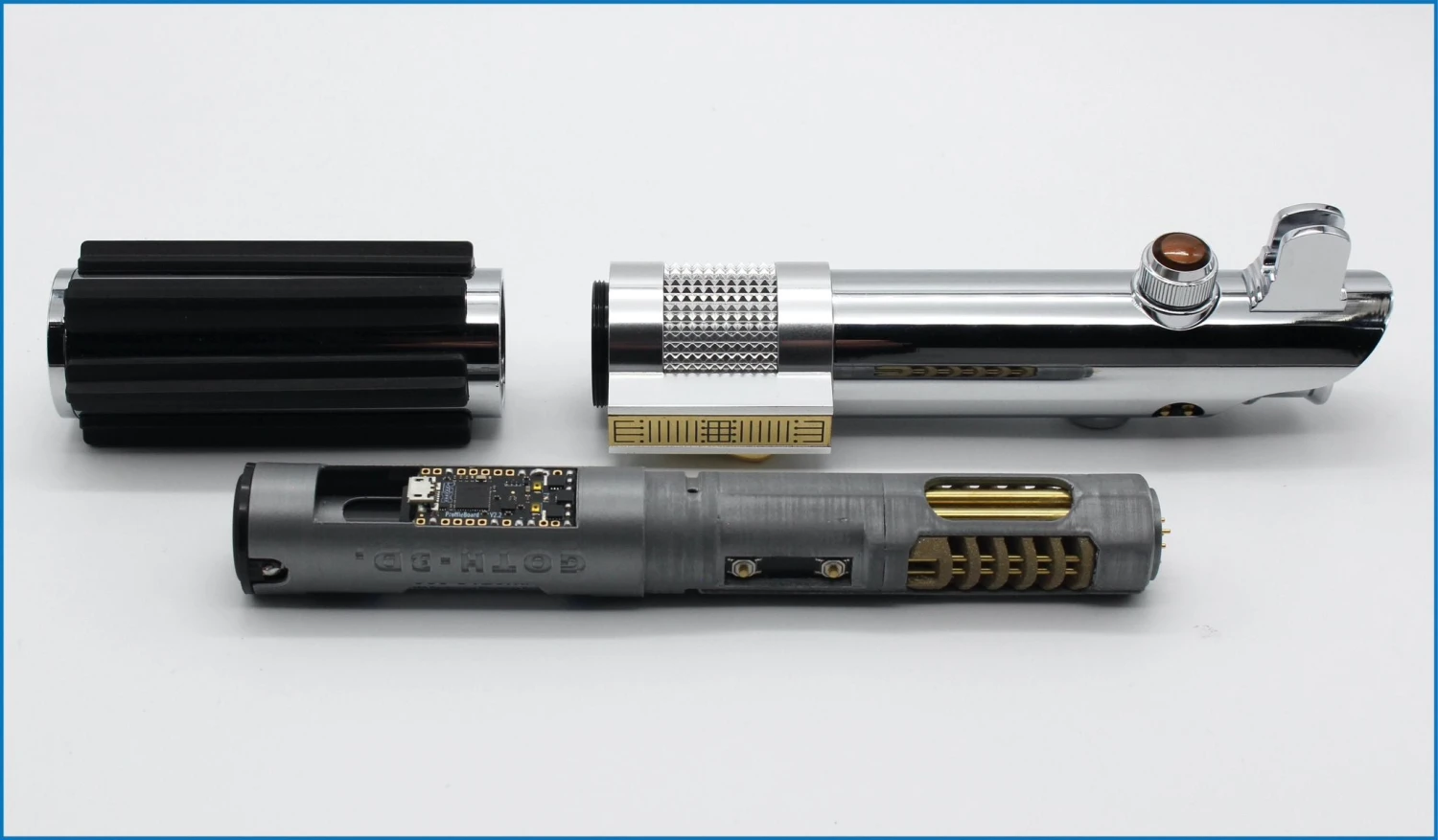 KR Sabers is on of the most the most sought-after and collected saber makers in not only the UK but the whole world. He has collaborated with Elf sabers to produce one of the most accurate and beautiful Anakin Inspired hilts to date. Installed by Blackstar Sabers with a completely removable eco cc 3d printed crystal chassis by Goth3Designes. This sabers comes with a 7/8″ x 36″ blade. This saber is not designed for duelling. Collectors edition magazine included