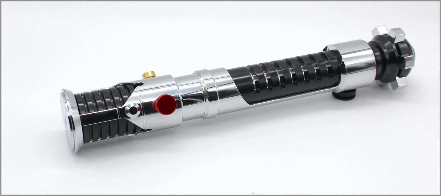 KR Sabers is on of the most the most sought-after and collected saber makers in not only the UK but the whole world. He has teamed up again with One Replicas to produce this incredibly accurate Obi Wan Inspired hilt from Episode 2 “Attack of the Clones” . Made from AL6061 and Brass, the brass parts have been beautifully chrome plated giving the hilt a very hefty feel. Installed by Blackstar Sabers with a 3d printed chassis by Goth3Designes. This sabers comes with a 1″ x 36″ blade. This saber is not designed for duelling. Collectors edition magazine included.