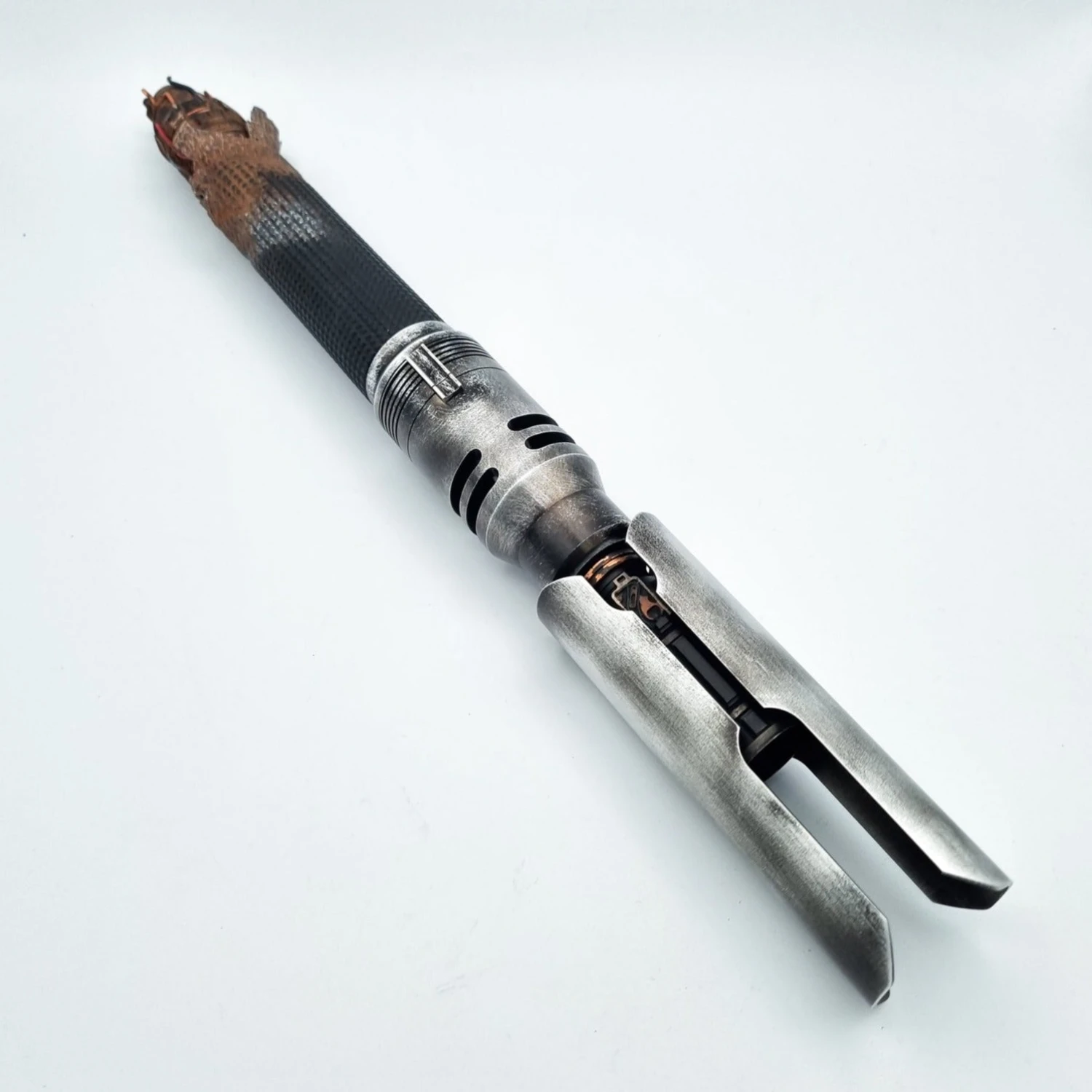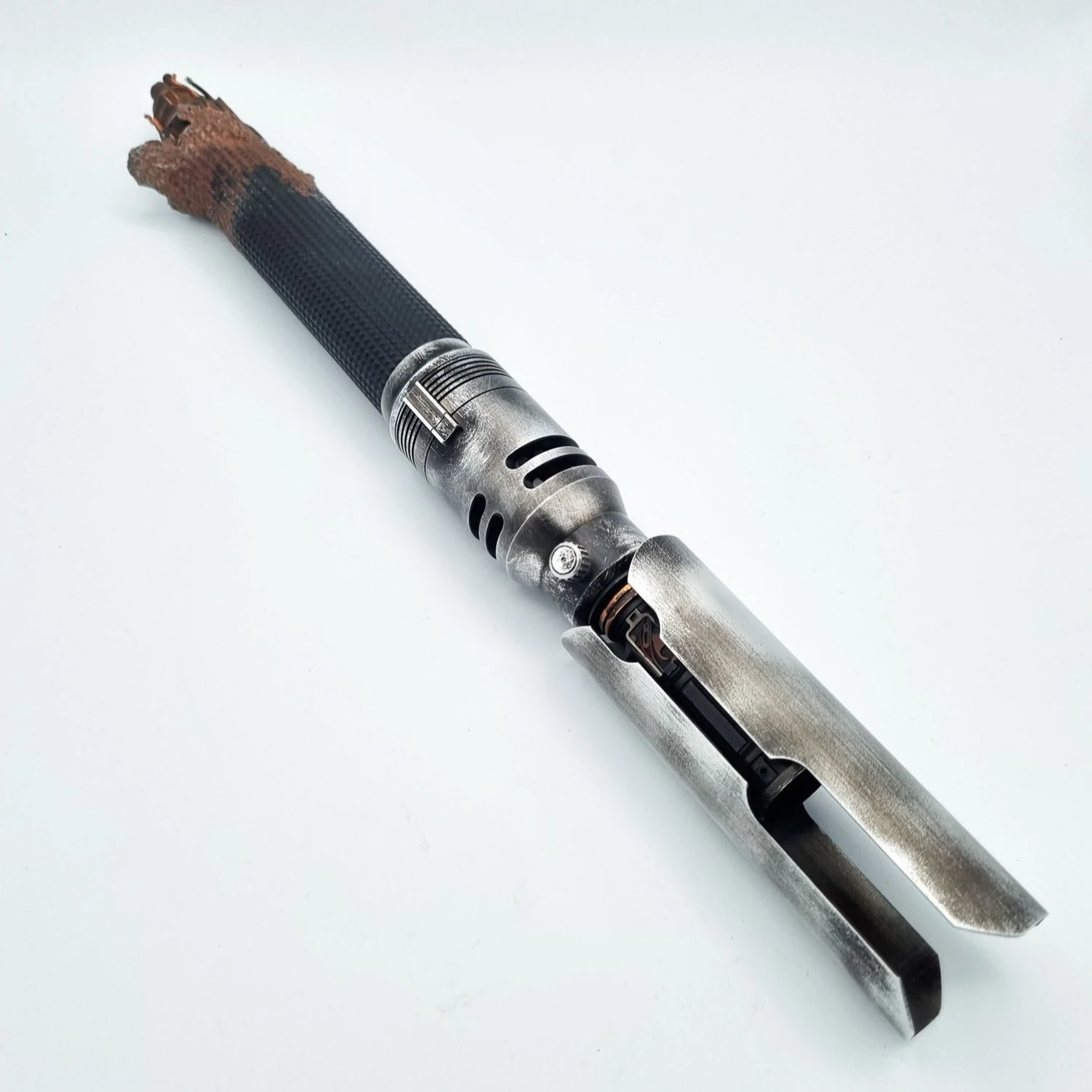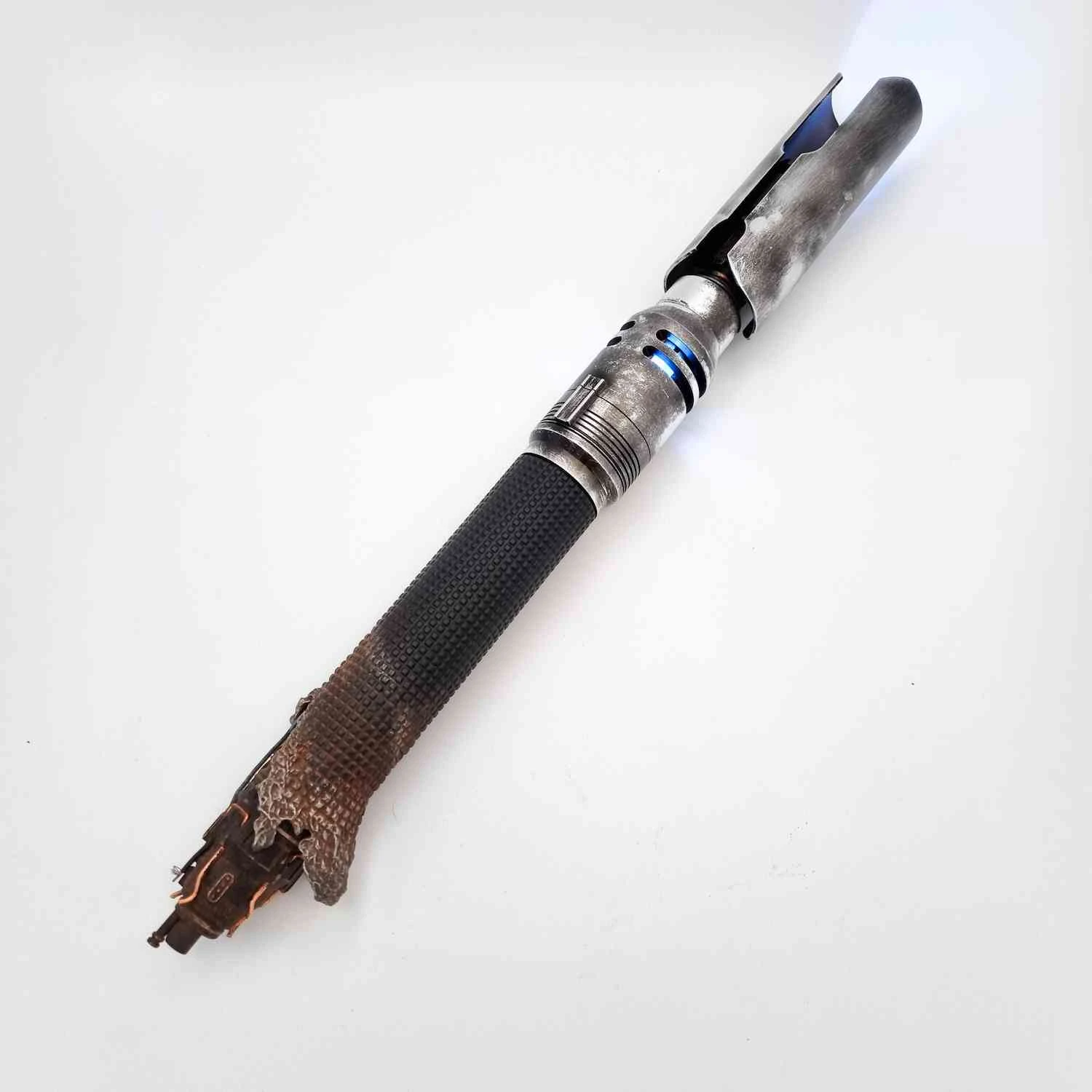 A true master piece by saber maker Dennis Lukyanov. The “Oggdo Killer” hilts were limited to only 300 hilts, and quickly became one of the most sought-after hilts in the lightsaber community. Based on the hilt wielded by Cal Kestis from the game “fallen Order”. In addition to this already incredible hilt, Josh from Multiverse props has weathered these to perfection, and the combination of these two masters of their trade, means we may have a Cal Kestis hilt, that may never be bettered.