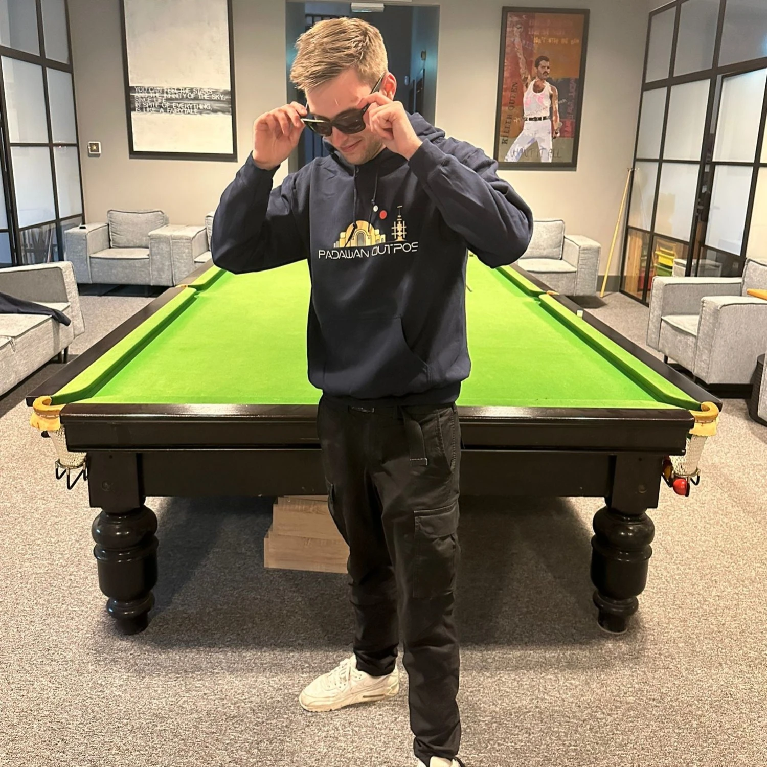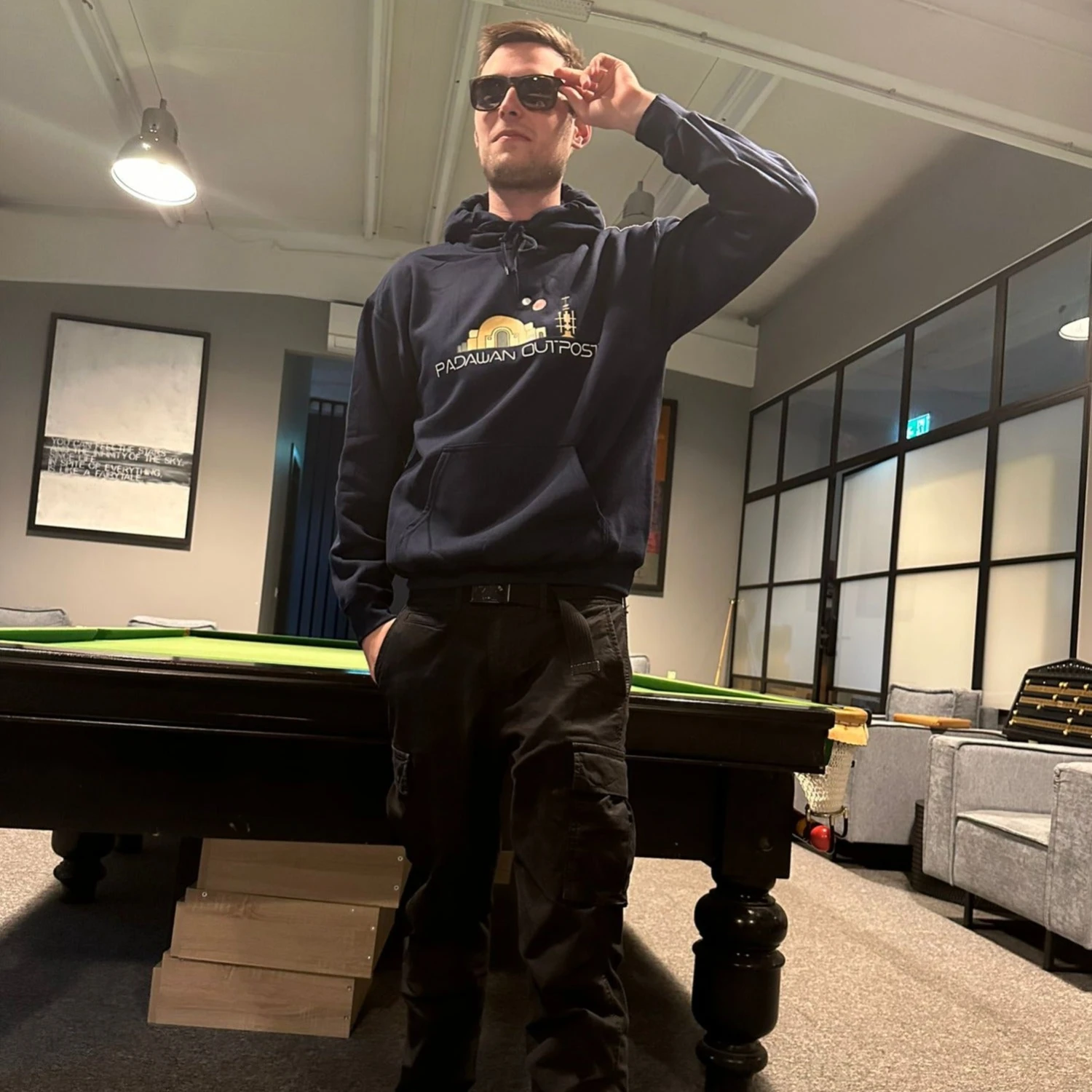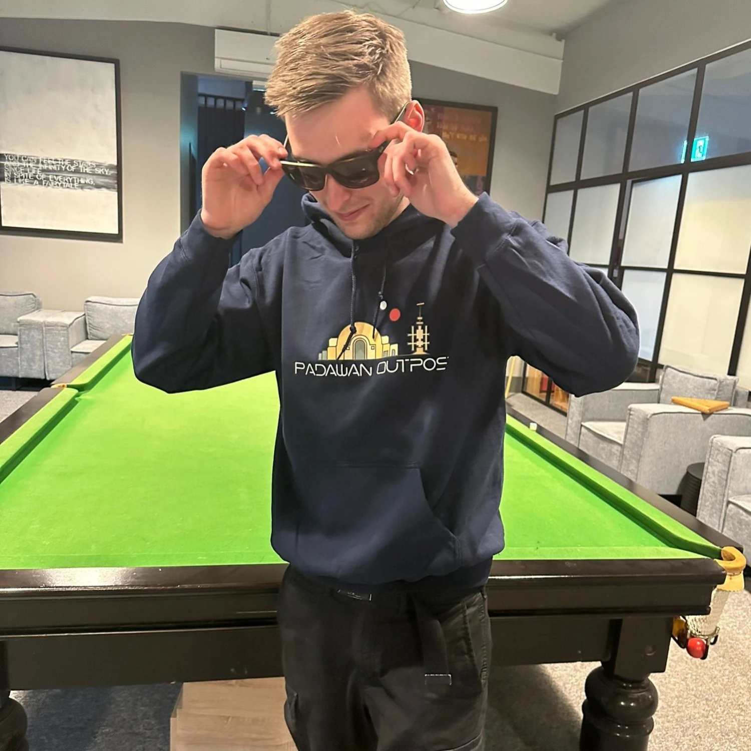 High quality Navy Padawan Outpost large logo hoodie.